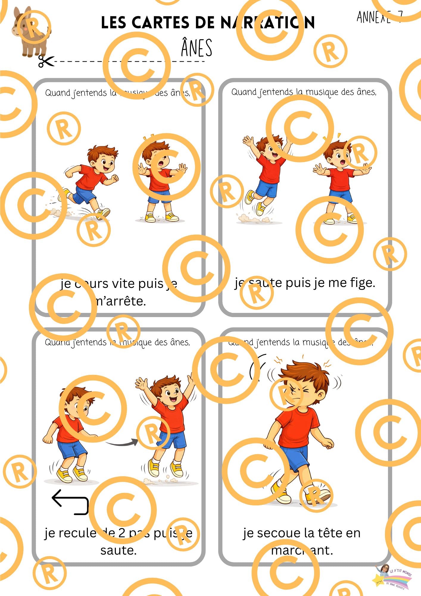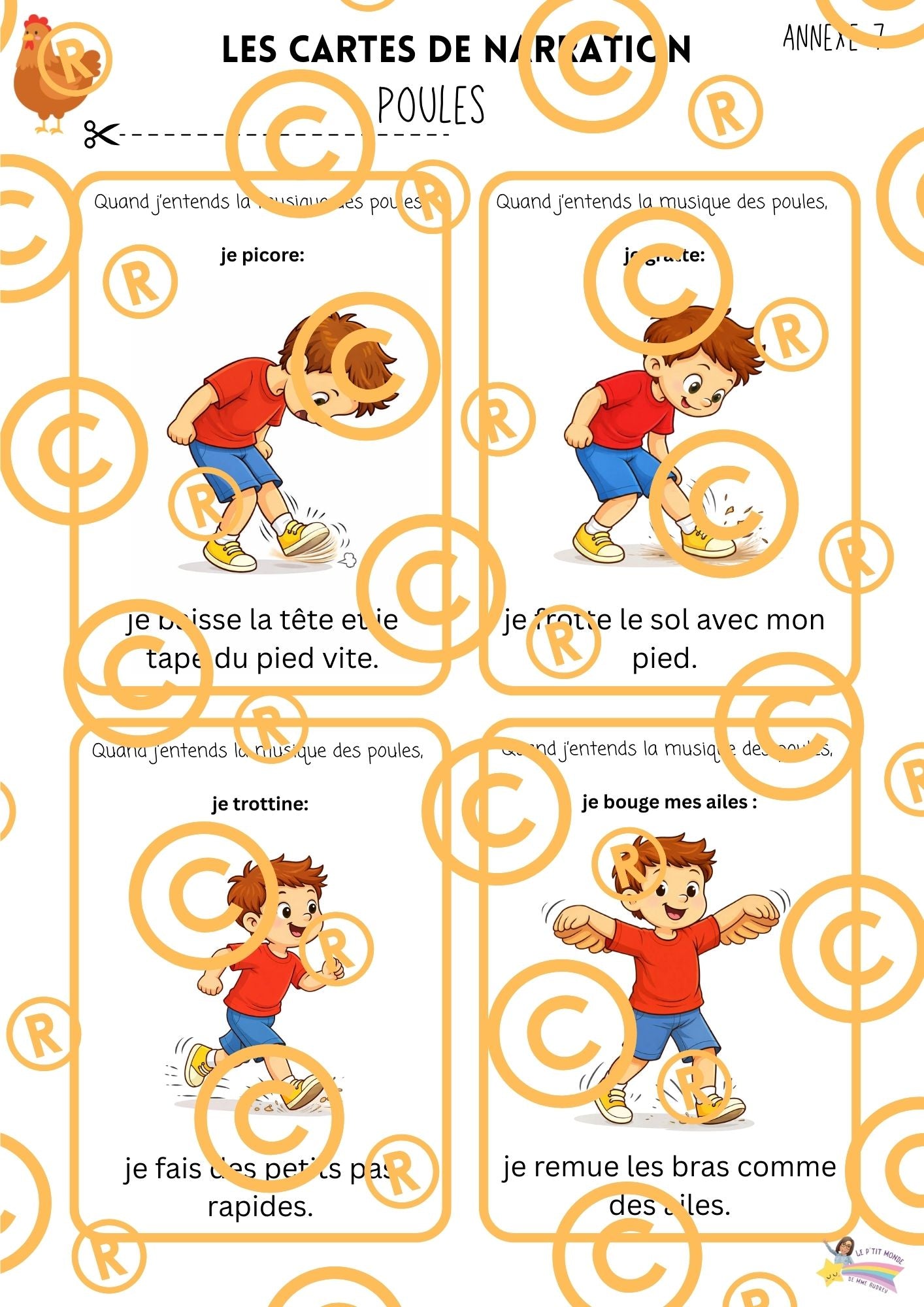 • Des cartes de narration et des cartes de mouvements corporels, idéales pour travailler l’expression, l’écoute active et la mémorisation tout en favorisant l’entrée dans le langage.