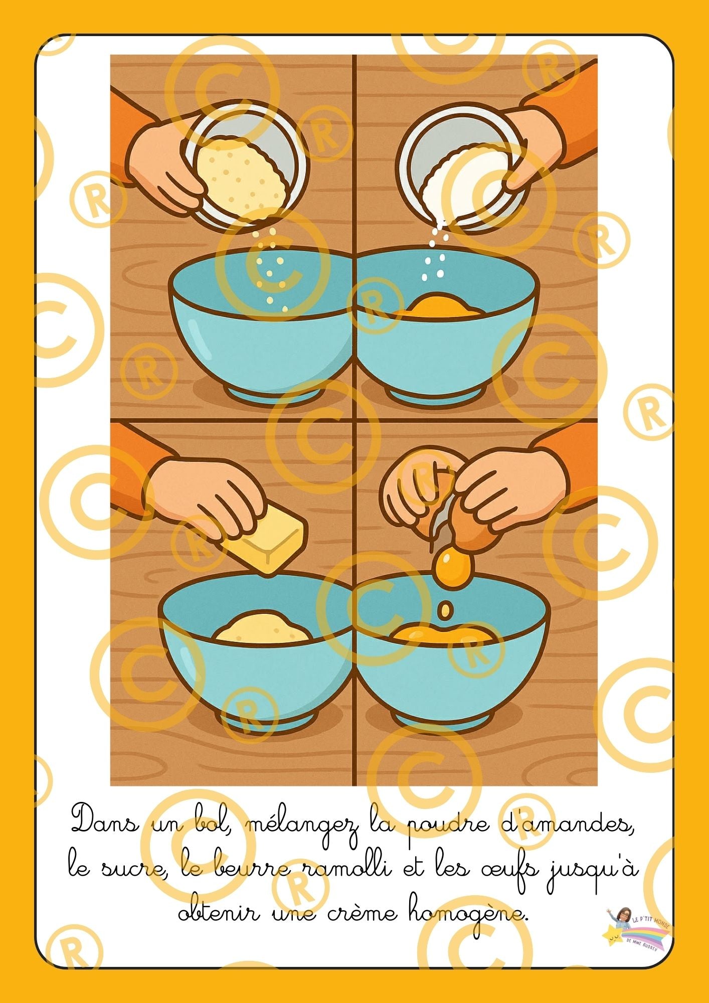 • Une super recette illustrée de la galette des rois Étape par étape, en version cartoon : idéale pour cuisiner en classe, travailler le lexique, l’ordre chronologique, les actions et les gestes.