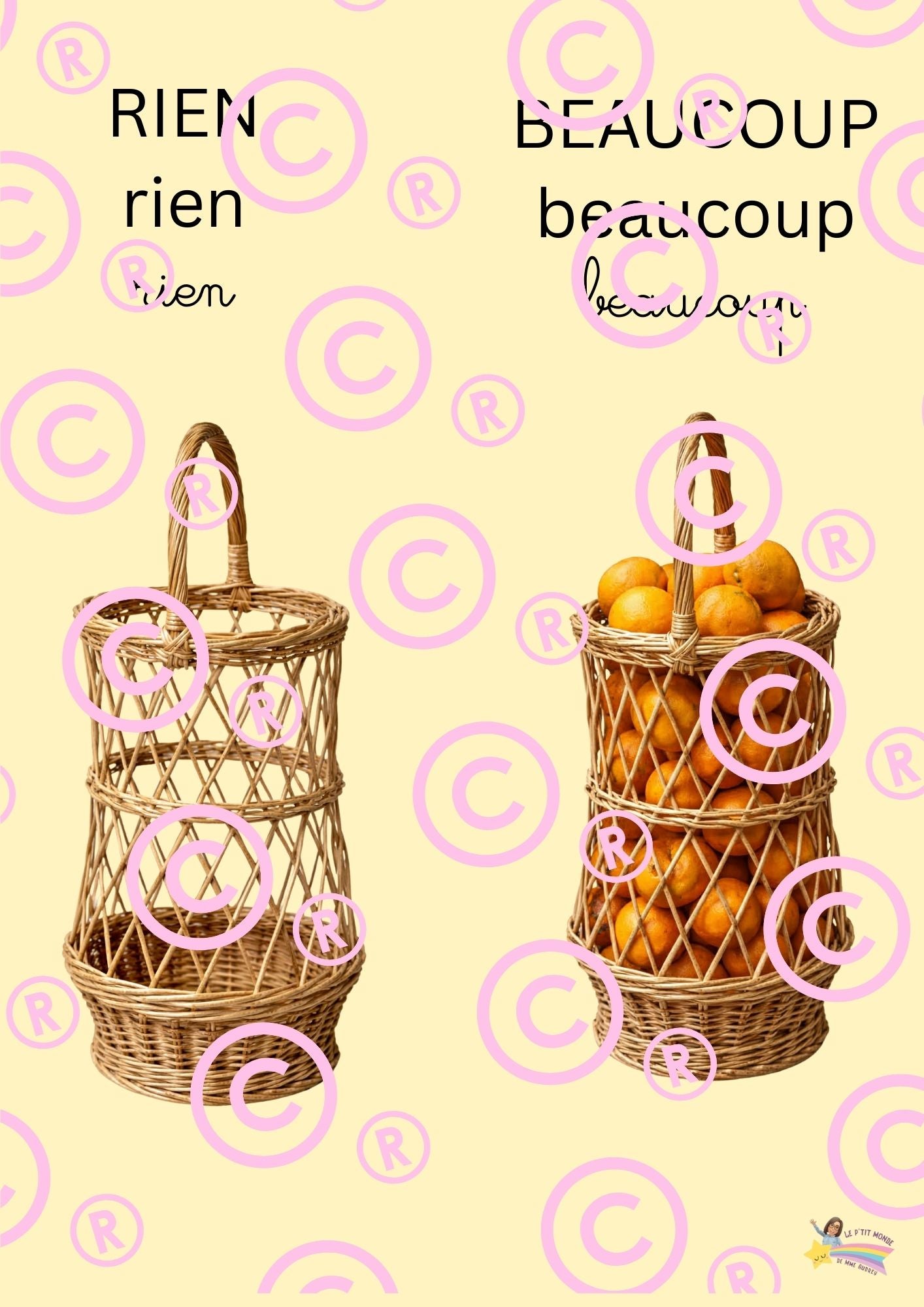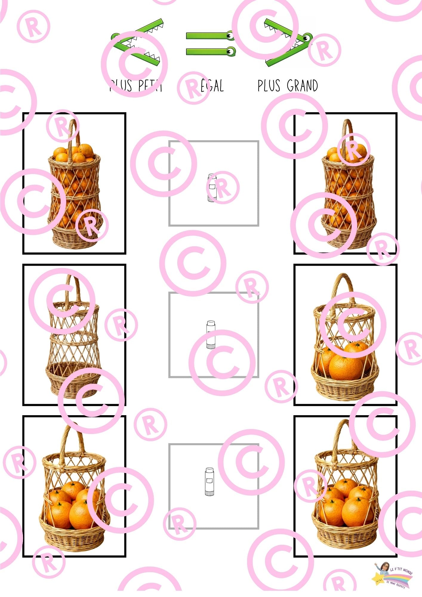 • Organisation, affiches, mise en scène, musique Ateliers & documents pluridisciplinaires • Logique, vocabulaire, graphisme, structuration spatiale • Grandeurs : rien / peu / beaucoup / plusieurs • Jeux mathématiques à plastifier • Jeu du crocodile : > = < • Dénombrement, discrimination visuelle • Coloriages codés, aquarelle, découpage, collage • Recette illustrée : jus d’orange sanguine + chronologie ⸻