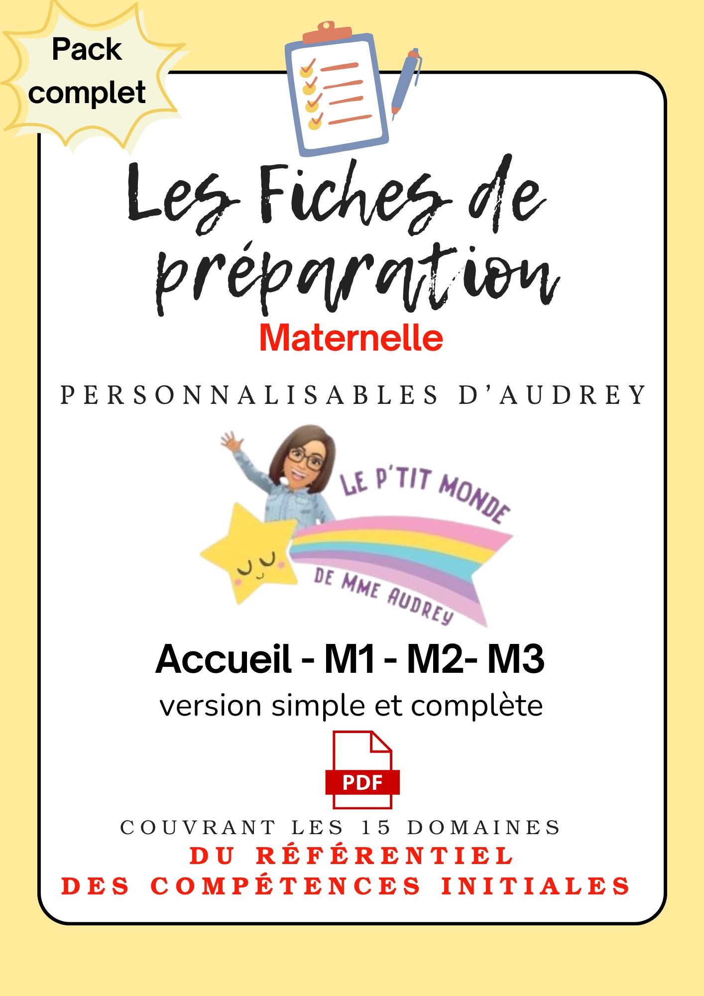 Ce pack en PDF rassemble des préparations de leçons entièrement personnalisables, conçues pour tous les niveaux de maternelle : Accueil, M1, M2 et M3.